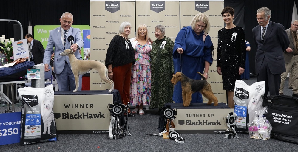SUPREME TOY Gr. Ch. We Will Rock U With Affitude (Affenpinscher) owned by Kirsten Wylie SUPREME TERRIER Karabal Pistols At Dawn (Welsh Terrier) owned by Amelia Price-Gosman & Adam Feaver SUPREME GUNDOG Hawkwood Rhinestone Cowboy (Golden Retriever) owned by Hannah Gale SUPREME HOUND NZ Spr. Ch. Bonnymead Peaches NCream (Imp. Aust.) (Whippet) owned by Hank Faifua & Tony Fox SUPREME WORKING DOG Gr. Ch. Cordmaker Rainbow N Lolipops (Hungarian Puli) owned by K. Stewart, S. Huebner & P. Kelly SUPREME UTILITY DOG Ch. Kursharn The Black Prince (Samoyed) owned by David McCormick & Jessica Hayes SUPREME NON SPORTING CIB & NZ Spr. Chic Choix Dream A Little Dream Of Me (Imp. Fin.) (Lhasa Apso) owned by D. Gilchrist & Anna Ancell BEST GENTLEMAN & DOG COMBINATION Blake Houtos and the Samoyed Ch. Kursharn The Black Prince BEST LADY & DOG COMBINATION Kirsten Wylie and the Affenpinscher Gr. Ch. We Will Rock U With Affitude SUPREME NZ BRED IN CONTEST Karabal Pistols At Dawn (Welsh Terrier) owned by Amelia Price-Gosman & Adam Feaver SUPREME VISITOR Ch. Tasdale Something T Talk About (Australian Terrier) owned by Mark Lawrence & Catherine McManus SUPREME VETERAN CIB & NZ Spr. Chic Choix Dream A Little Dream Of Me (Imp. Fin.) (Lhasa Apso) owned by D. Gilchrist & Anna Ancell SUPREME PERSONALITY Hawkwood Rhinestone Cowboy (Golden Retriever) owned by Hannah Gale